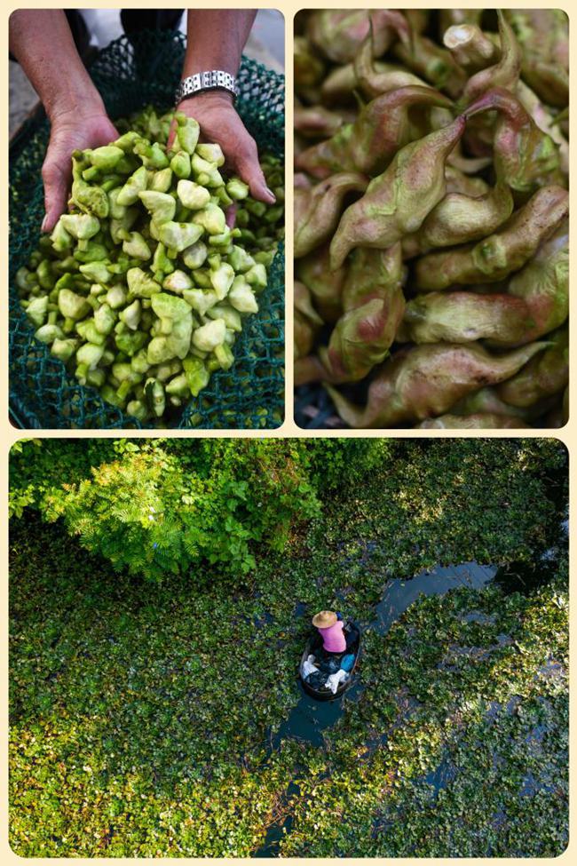 마름열매는 수생식물 과실로 별미다. 초가을 신선할 때 딴 마름열매는 생으로 먹을 수 있는데, 바삭하고 부드러운 식감에 단맛도 난다. 삶으면 식감이 밤 같고 달다.