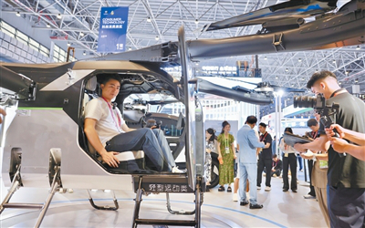 제6회 CICPE 과학기술소비 전시구역을 찾은 관람객이 분리형 플라잉카 시승 체험을 하고 있다. [사진 출처: 인민일보]